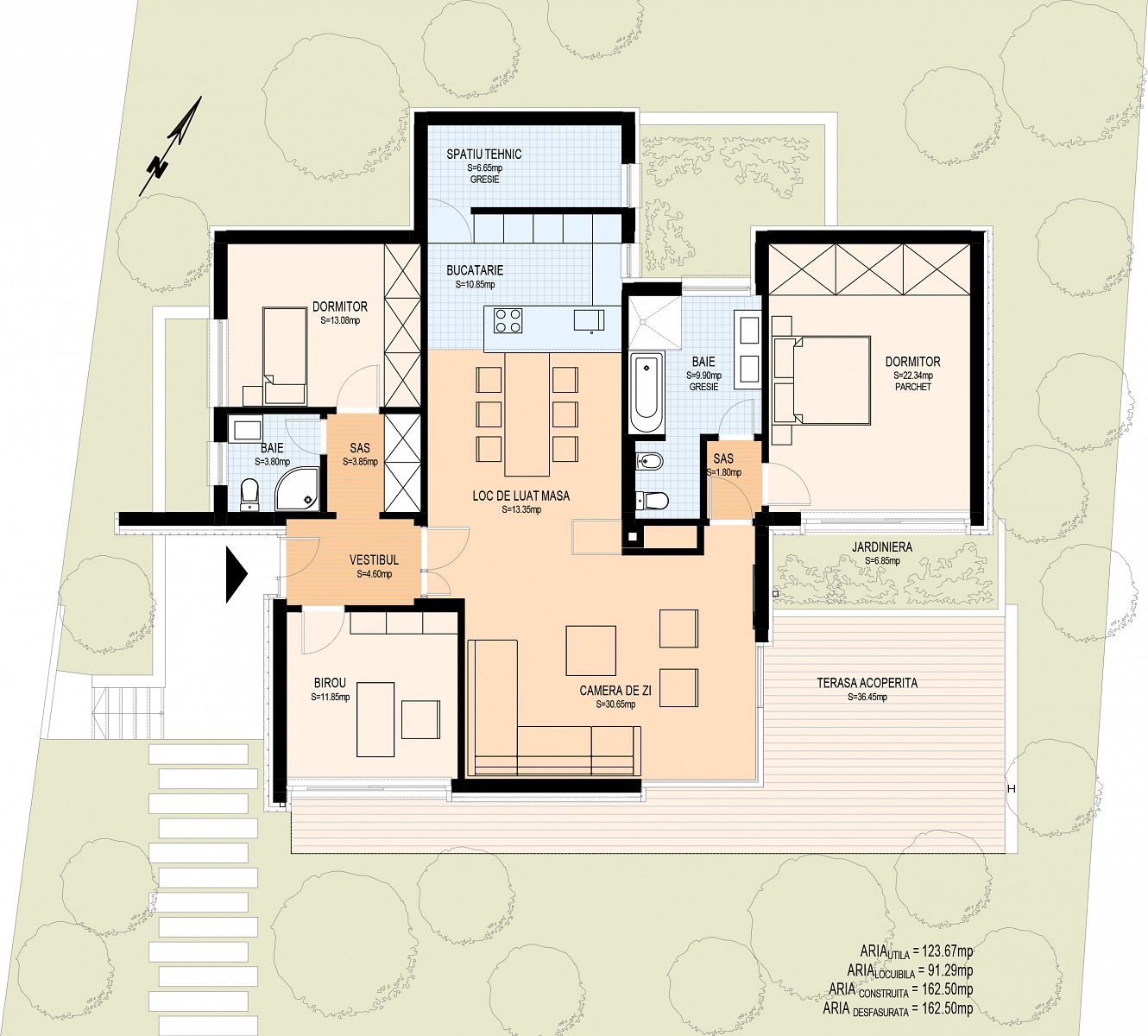 Construcție nouă, dispusă pe un singur nivel, compusă din: bucătărie, living, loc de luat masă, birou, două dormitoare, două bai, spațiu tehnic, terasa acoperită, în suprafață utilă de 123.67 mp, suprafață desfășurată de 162.50 mp.